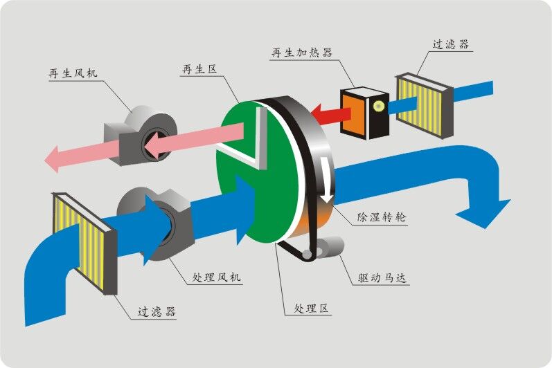 在再生過(guò)程中,再生空氣經(jīng)過(guò)加熱后(120℃左右),進(jìn)入轉(zhuǎn)輪再生區(qū)扇面,在高溫狀態(tài)下,轉(zhuǎn)輪中的水分子被脫附,散失到再生 空氣中。再生空氣由于在脫附過(guò)程中損失了熱量,自身溫度降低,變成了含濕量很大的濕空氣 ,由再生風(fēng)機(jī)排至室外。除濕和再生同時(shí)進(jìn)行,待處理空氣不斷除濕,轉(zhuǎn)輪不斷再生,對(duì)空氣進(jìn)行連續(xù)除濕。