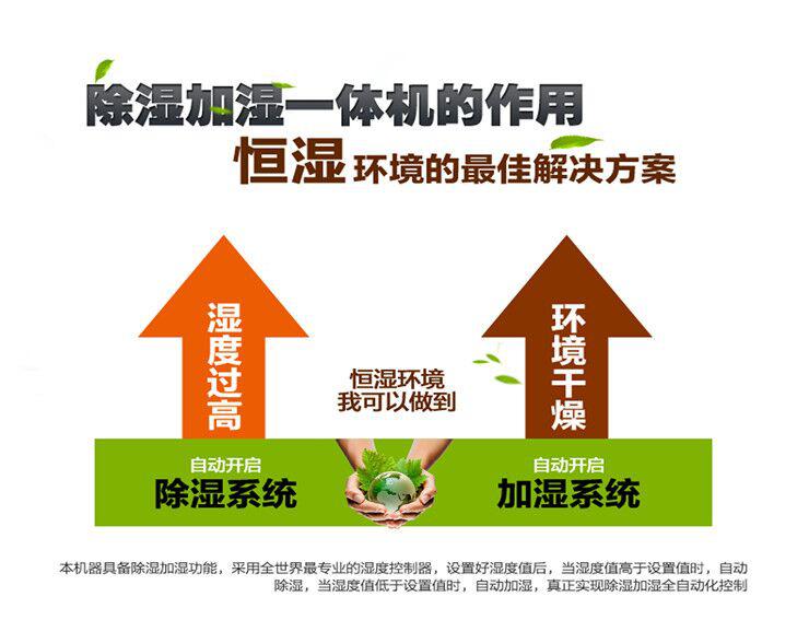 ◎除濕加濕一體機(jī)的作用:一臺(tái)機(jī)器具備除濕功能、加濕功能,設(shè)置好濕度,當(dāng)房間濕度值高于設(shè)置的濕度值時(shí),電腦板控制系統(tǒng)會(huì)起動(dòng)機(jī)器除濕功能模塊來進(jìn)行除濕,除濕的水經(jīng)排水管自動(dòng)排出,達(dá)到設(shè)定的濕度值時(shí)會(huì)自動(dòng)停機(jī);當(dāng)干燥天氣,設(shè)定的濕度值低于濕度值時(shí),電腦板控制系統(tǒng)會(huì)起動(dòng)機(jī)器加濕功能模塊來進(jìn)行加濕,加濕的水源需連接到機(jī)器上,為DN25進(jìn)水管,達(dá)到設(shè)定的濕度值時(shí)會(huì)自動(dòng)停機(jī);